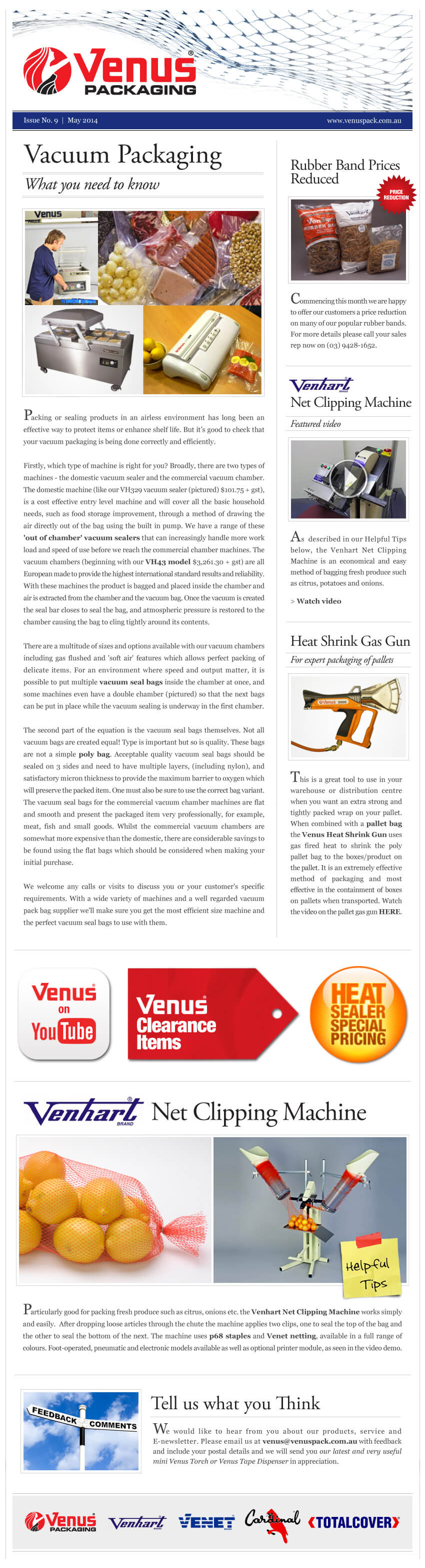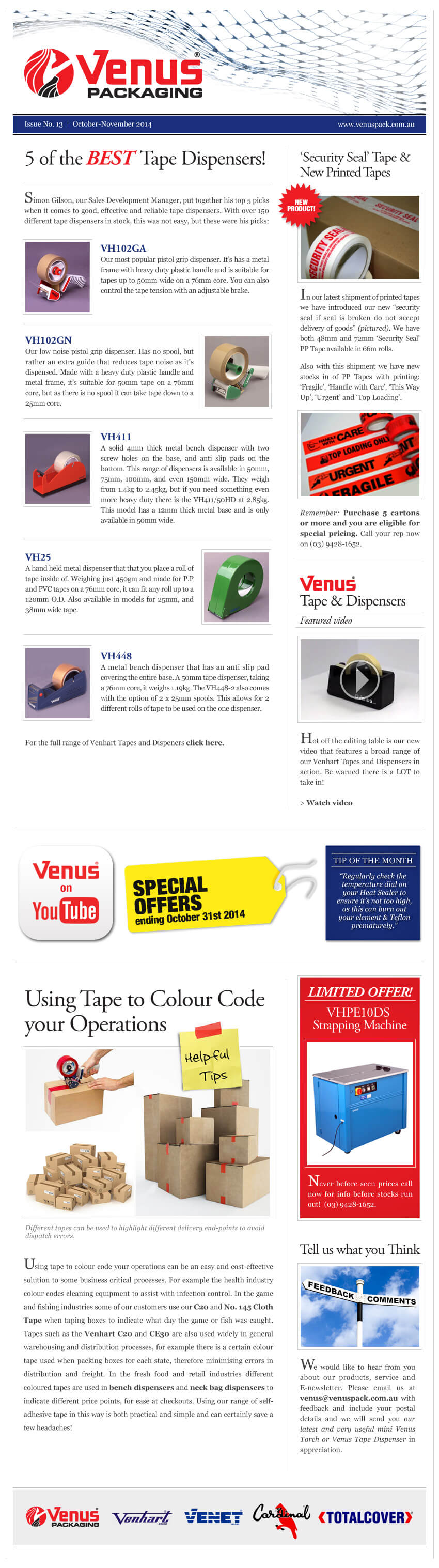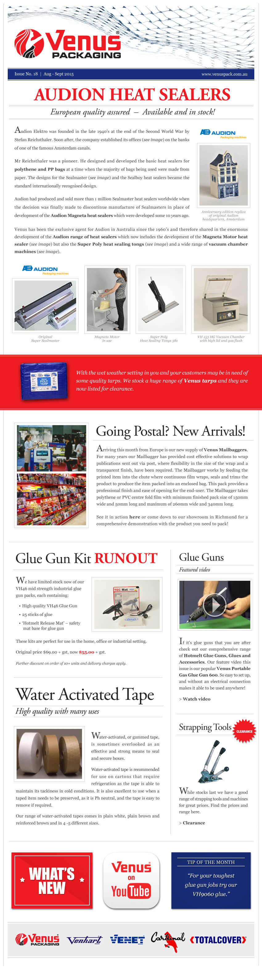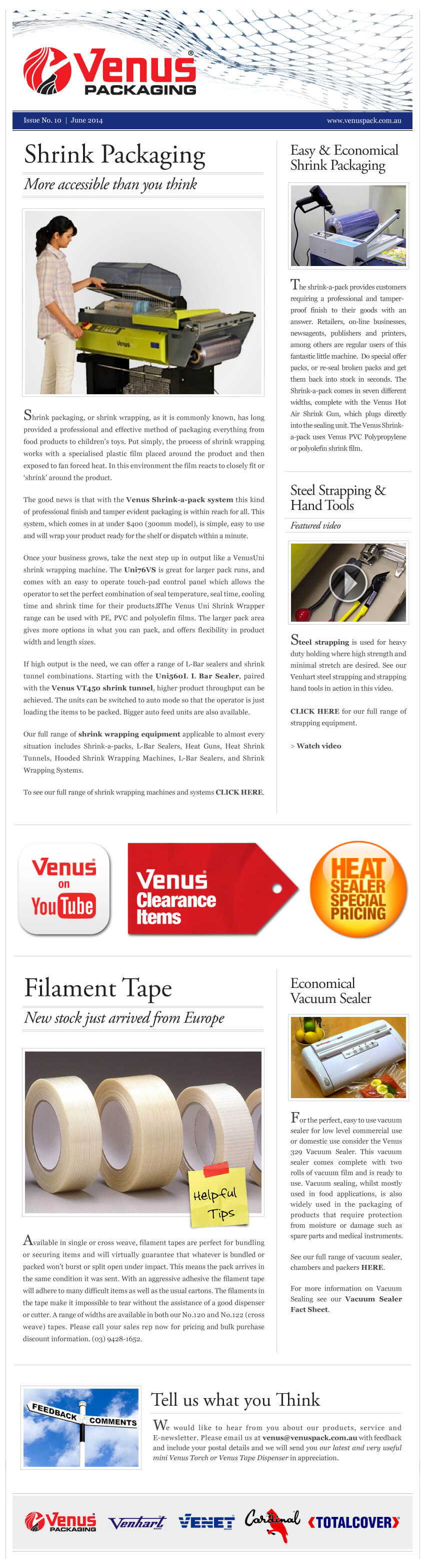 Venus E-News is packed with helpful articles and information on packaging materials and packaging machines. To subscribe email venus@venuspack.com.au with the subject Venus E-News. Click the covers to download back issues.