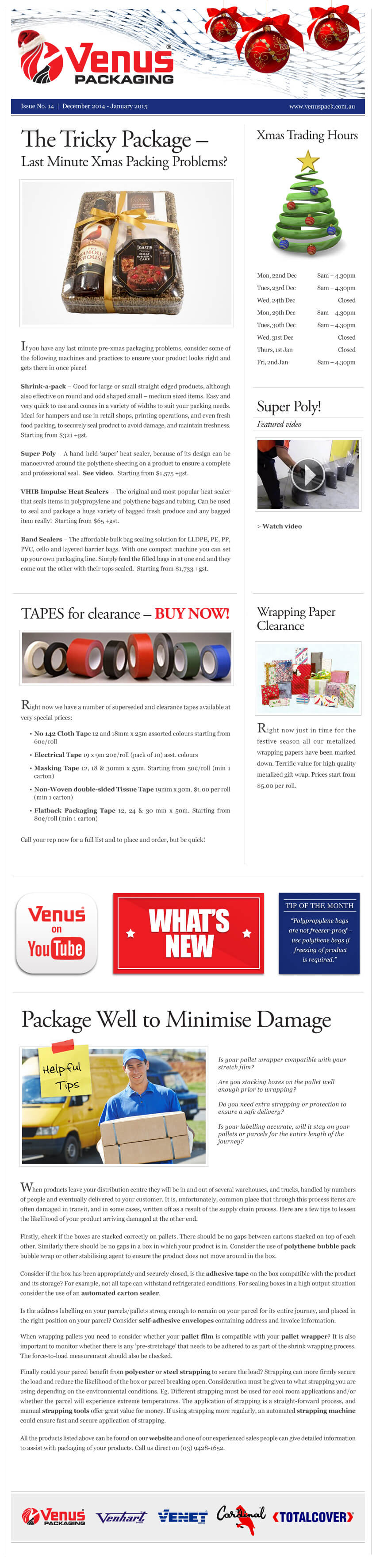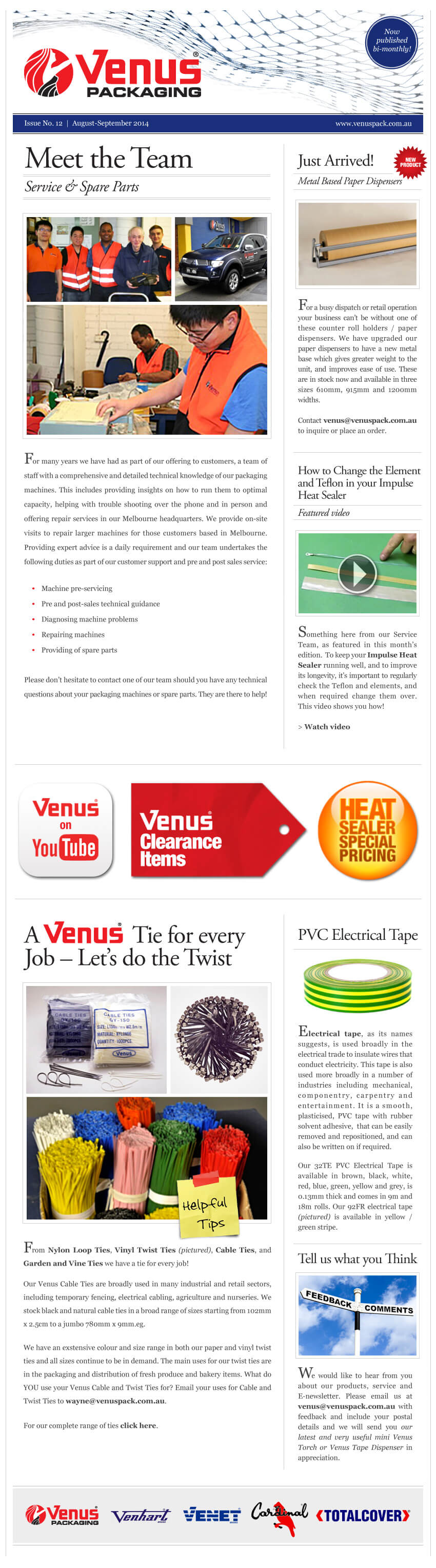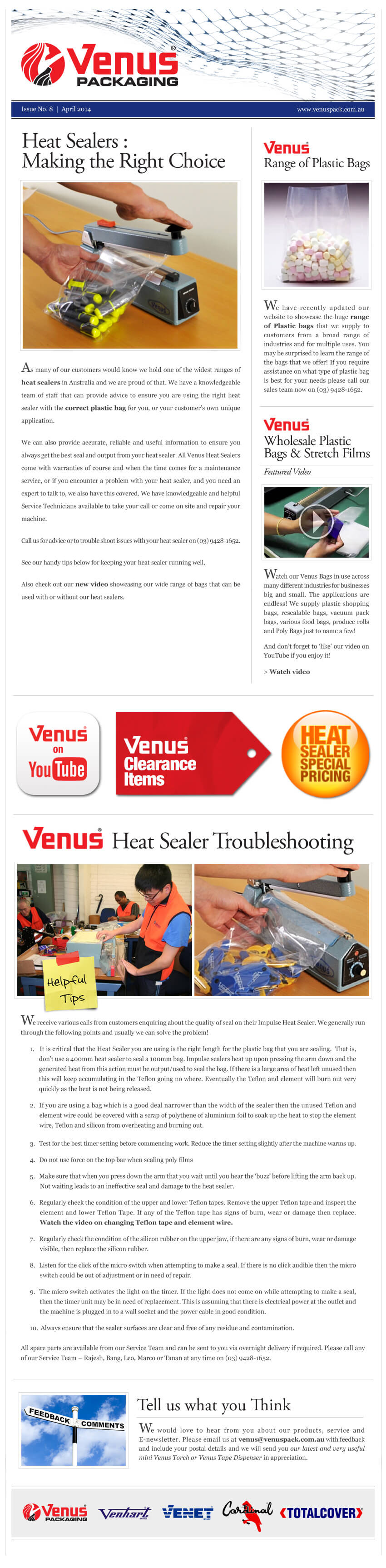 Venus E-News is packed with helpful articles and information on packaging materials and packaging machines. To subscribe email venus@venuspack.com.au with the subject Venus E-News. Click the covers to download back issues.