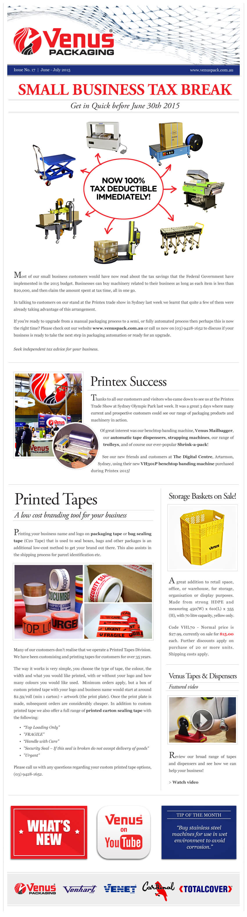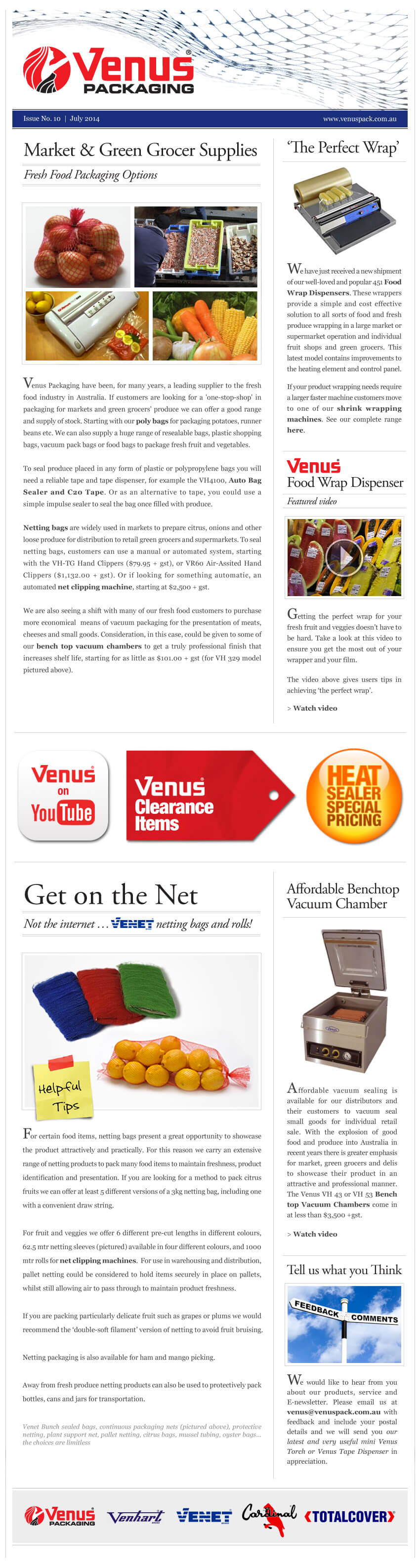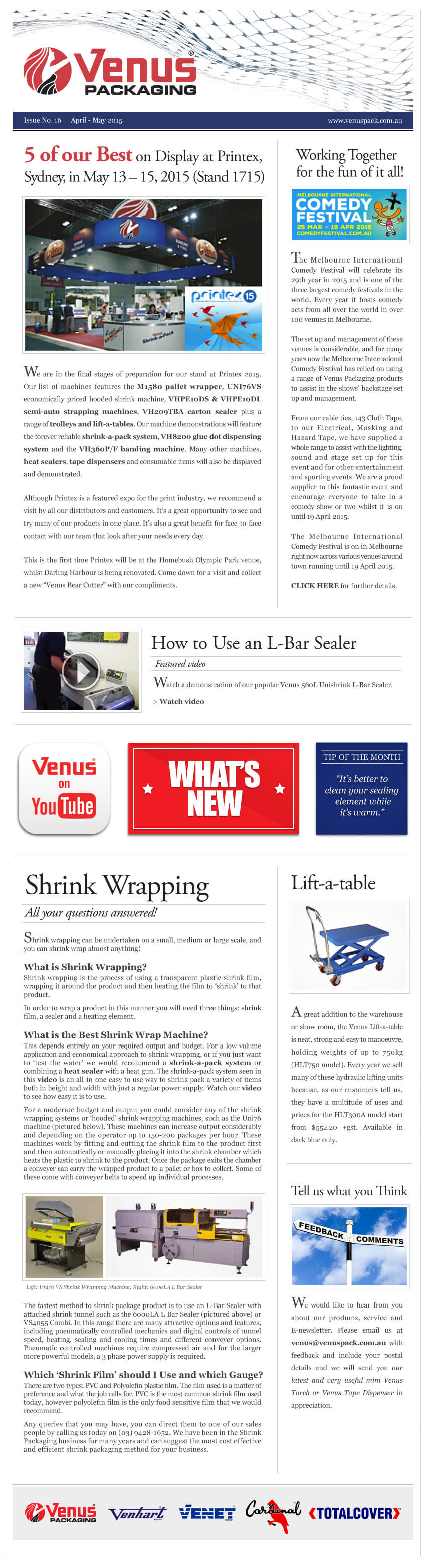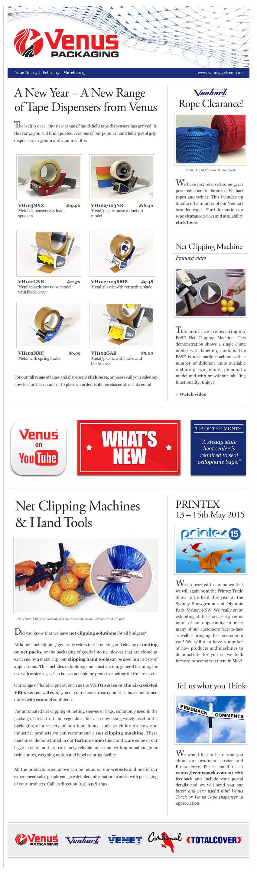Venus E-News is packed with helpful articles and information on packaging materials and packaging machines. To subscribe email venus@venuspack.com.au with the subject Venus E-News. Click the covers to download back issues.