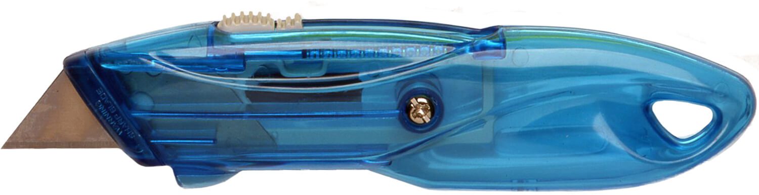 Retractable blade cutter featuring a spring-loaded safety blade that retracts automatically. -