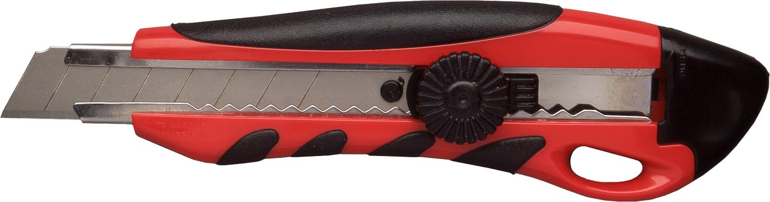 Heavy duty cutter with rubber grip insets, stainless steel chamber, finger screw safety lock, blade snapper and 18mm blade. Colour; red/black. -