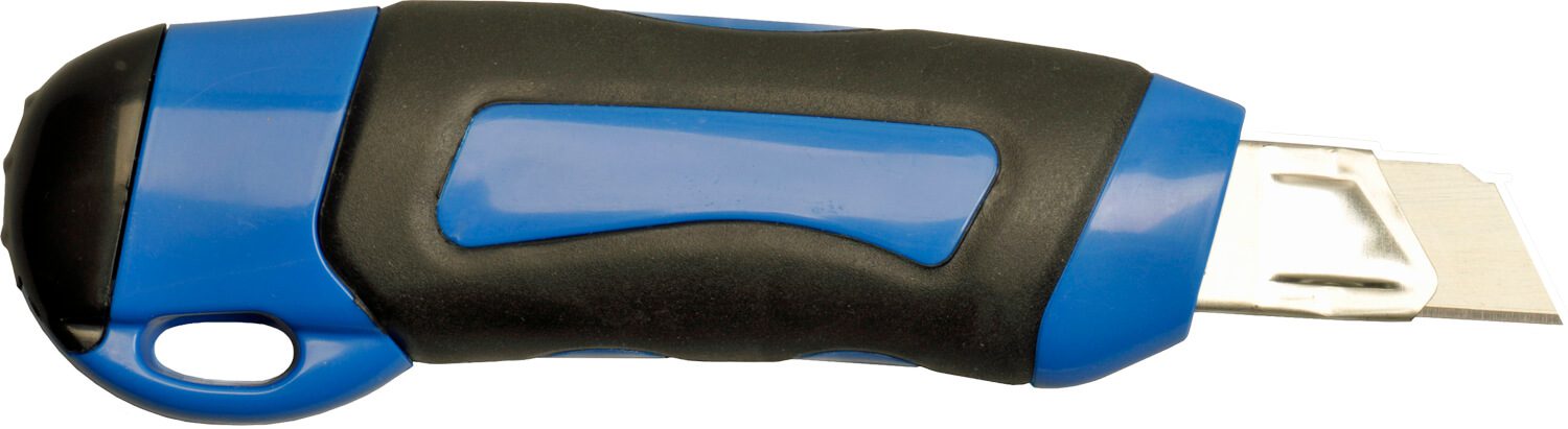 The VH37 features inset rubber grips, sliding thumb control and blade snapper. It is a heavy duty knife with 18mm blades. Colours: orange with black grips & silver with yellow grips. -