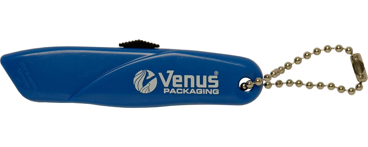 Mini retractable blade cutter, blue with key chain and printed 'Venus Packaging'. -