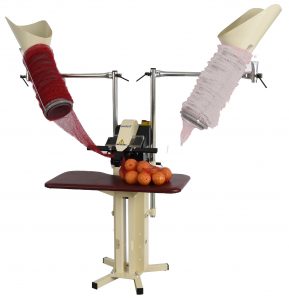 An output of up to 1800 bags per hour can be achieved with the twin chute version of this electric model (see above for single chute model). The clip is applied automatically when the operator inserts the netting into the clipping jaws. The stainless steel work table, 600mm wide x 330mm deep, adjusts easily from 400mm to 770mm high and is secured with a simple locking lever.- Machine dimensions (maximum) including two chutes: 2000mm wide x 840mm deep x 1500mm high.