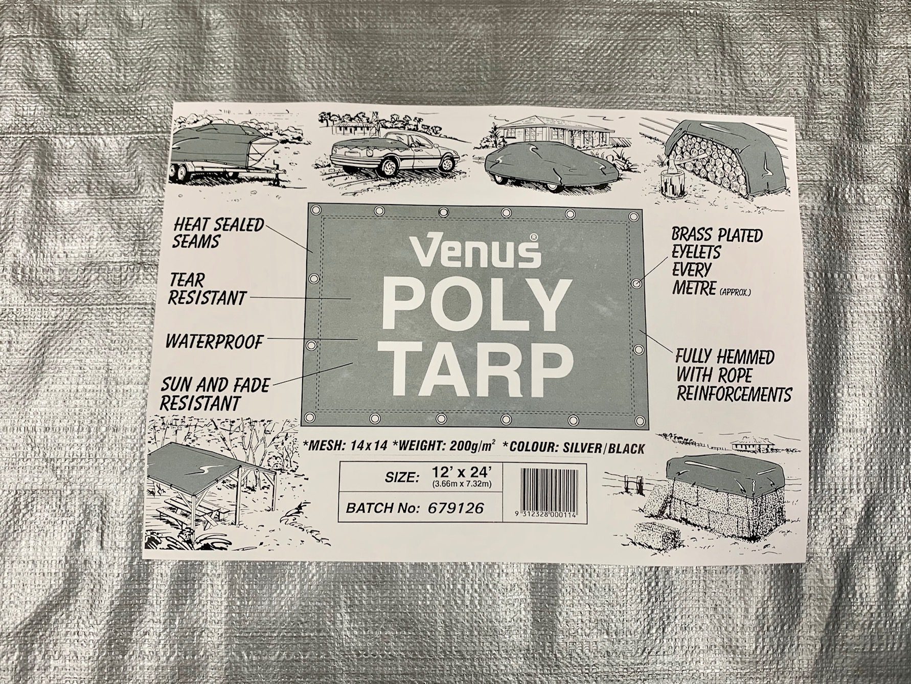 Venus heavy duty poly tarp made from 200gsm quality woven PE. These extremely heavy duty tarps have a multitude of uses and can be reused time after time. They come with heat sealed seams, brass plated eyelets for attaching ropes, and a durable black lining. Available in 5 different sizes, download PDF below for specs. Currently 15% off book price. -
