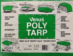 Venus heavy duty poly tarp made from 145gsm quality woven PE. These heavy duty tarps have a multitude of uses and can be reused time after time. They come with heat sealed seams, brass plated eyelets for attaching ropes, and reinforced corners. Available in 3 different sizes, download PDF below for specs. Currently 15% off book price. -