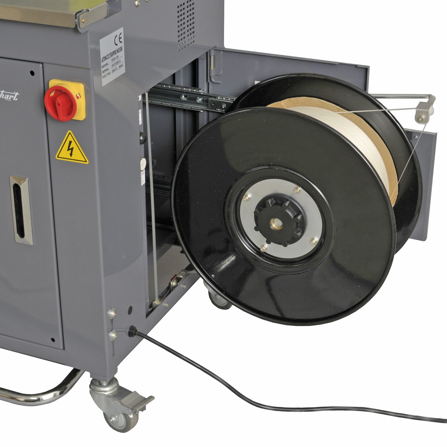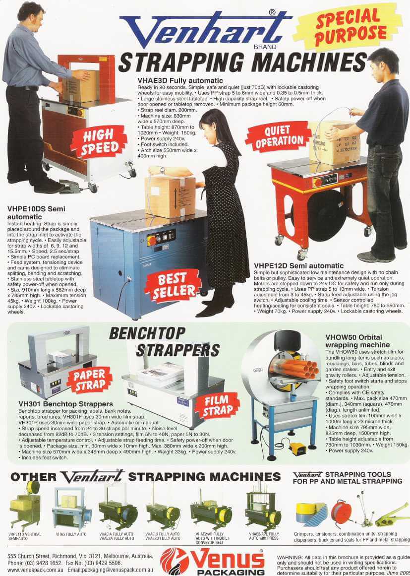Venhart automatic PP strapping machine with foot pedal, and simple external strap adjustment to 28kg. Strap ejector automatically clears unwanted strap and short feed sensor ensures operation only when strap is at the sealing position.- Speed: 28 straps per minute.