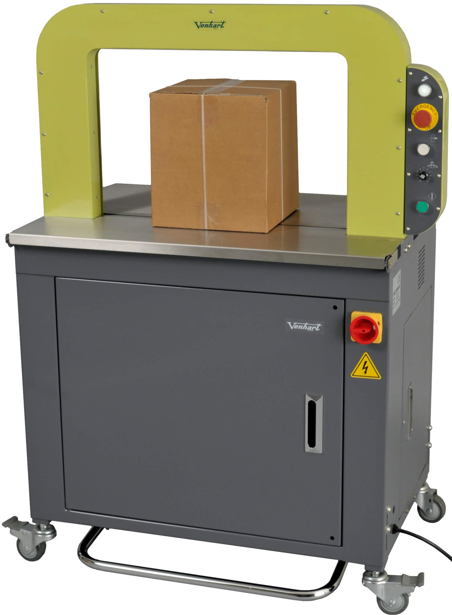 The Venhart VHAE5/6C applies strapping at up to 50 straps per minute using 6mm wide pp strap. Pressing the "Start" button or foot pedal straps one carton then feeds strap into the arch ready for the next. The temperature, cooling time and strap tension are all adjustable. Other features include a full width foot pedal bar, a safety stop button, strap back control, automatic strap discharge and anti-jamming systems. The machine enters energy saving standby mode when idle for 60 seconds.- Speed: 50 straps per minute.