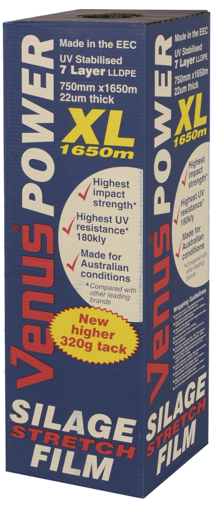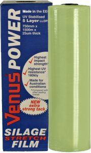 Made in Europe, VenusPower 5 layer LLDPE silage film has 320g tack for an air-tight seal with minimum tails. UV stabilised to suit Australian conditions, it resists up to 180kly (minimum 12 months).- Green 750mm wide Length: 1500m. Thickness: 25um; Rolls per pack: 1