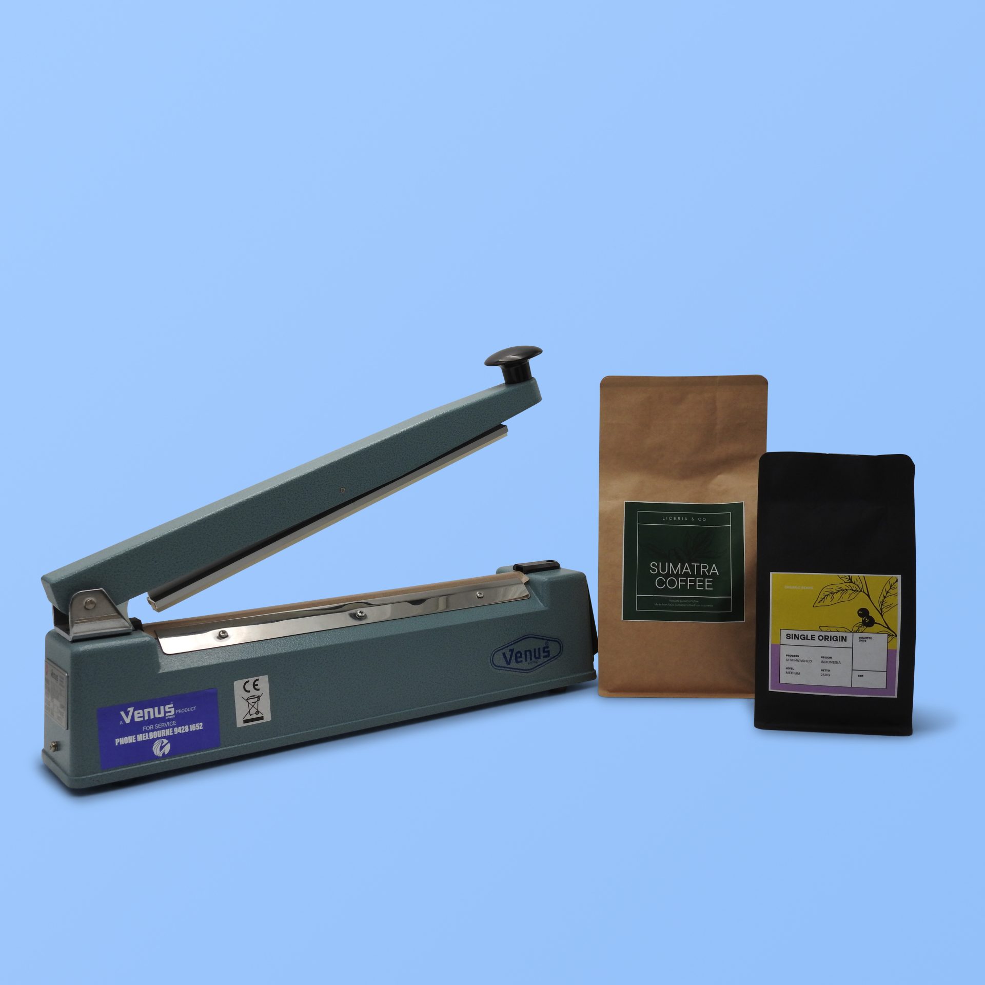 Upgrade your coffee‑packing workflow with this convenient bundle: Two packs of 250g Kraft Coffee Bags paired with your choice of a VHIB 305C Heat Sealer or a VHIB 405 Heat Sealer.