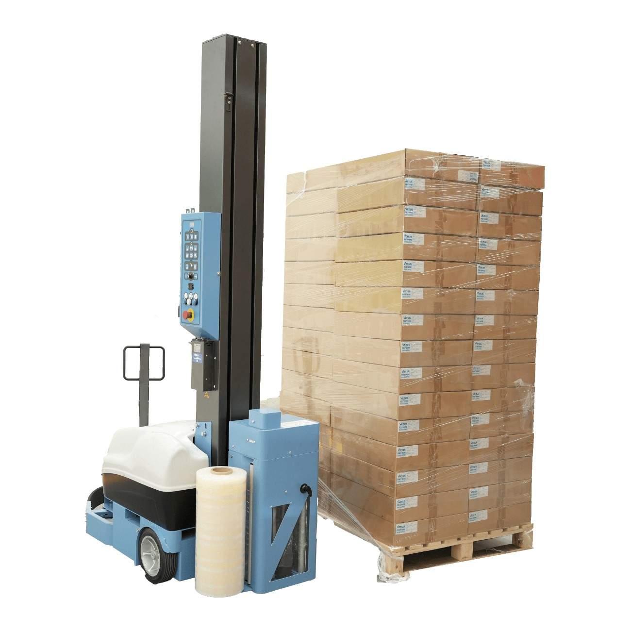 The Venus 630 Robot Pallet Wrapper is an innovative, self-driven machine that automatically wraps pallets at the press of a button. It takes up less space and is more portable than traditional turntable pallet wrapping machines. In manual mode, simply guide the robot pallet wrapper to your pallet, choose your desired settings on the touch control panel, then it will automatically begin wrapping the pallet while you can focus on other tasks.Â