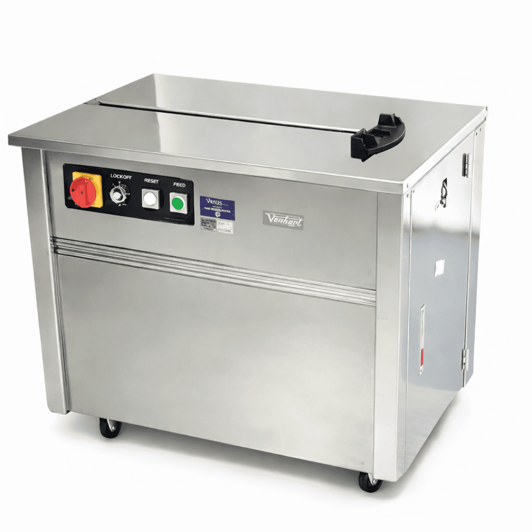 The VHPE10DSS is a semi-automatic strapping machine with a durable stainless steel frame, ideal for wet environments like seafood, meat, poultry, and agriculture. Designed for ease of use and low maintenance, it features energy-efficient operation, mechanical tension control, and lockable castors.