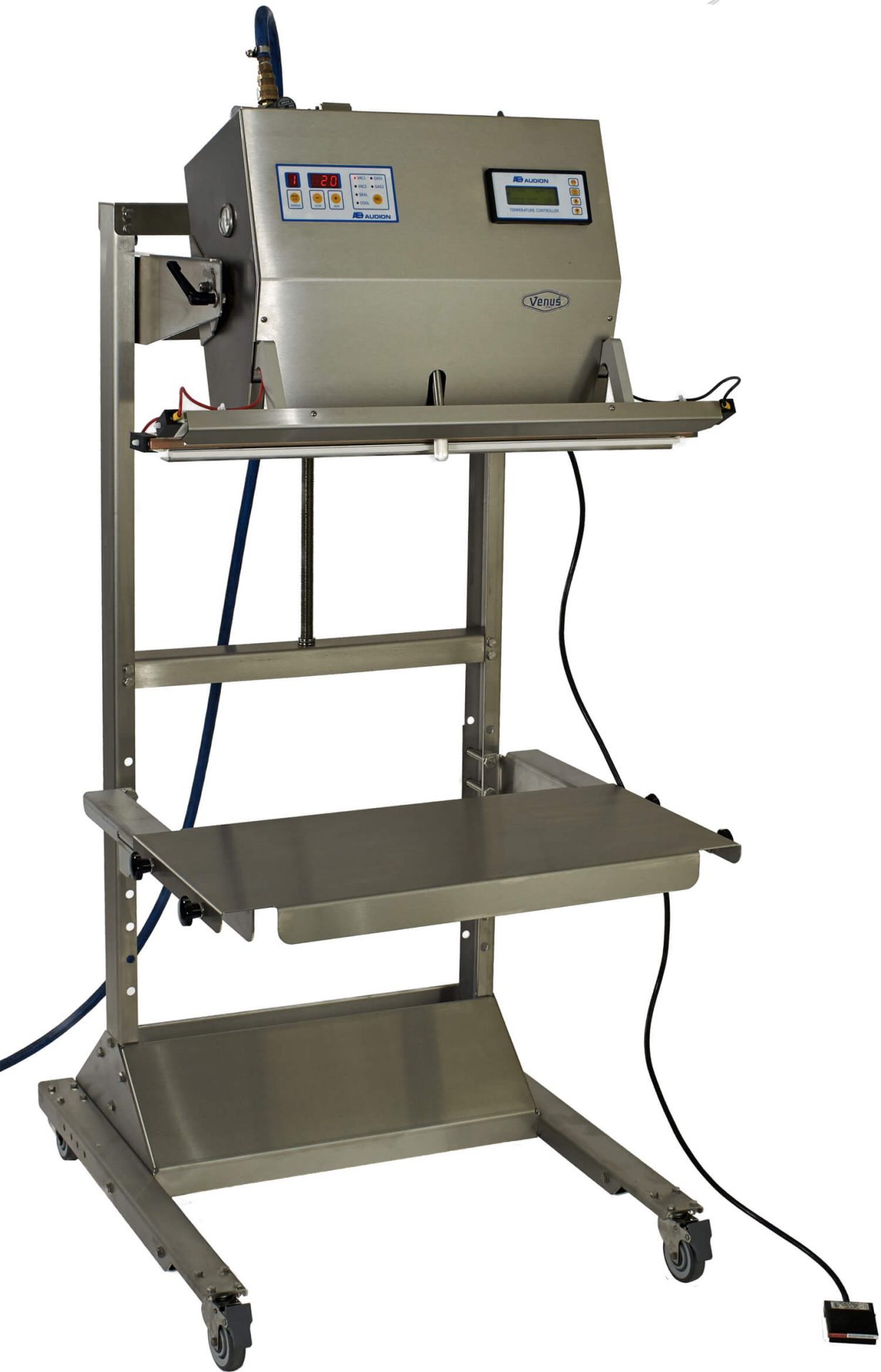The Audion Power Sealer 720MV Med is a powerful, stainless steel vacuum sealer equipped with a vacuum nozzle and bi-active sealing bars. This machine can be used for vacuum packaging and modified atmosphere packaging. It is available in two versions; a standard model and a model for validated sealing. This is particularly important in the medical and pharmaceutical industries, although validated packaging is becoming important in a range of industries now. The machine come standard with foot pedal operation.