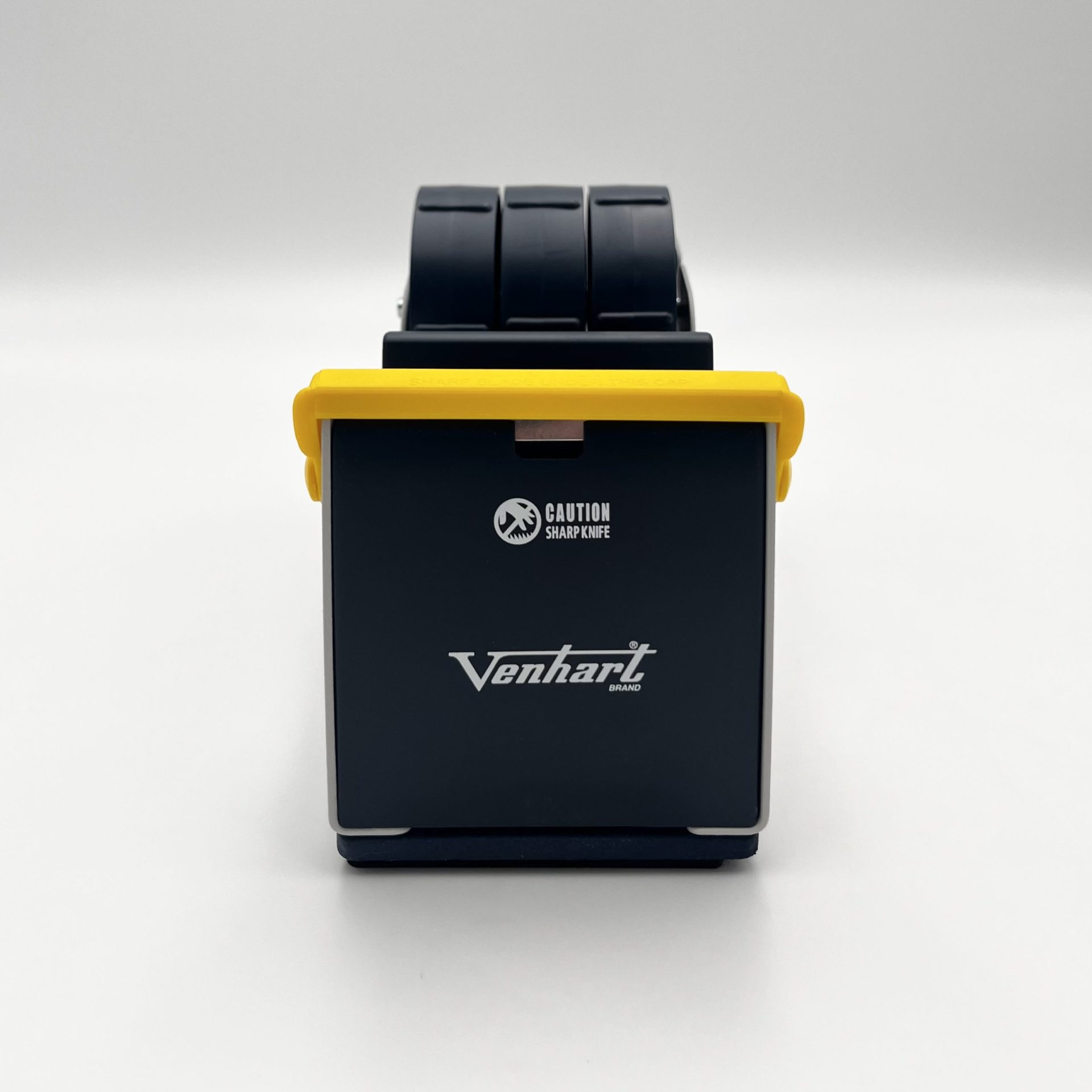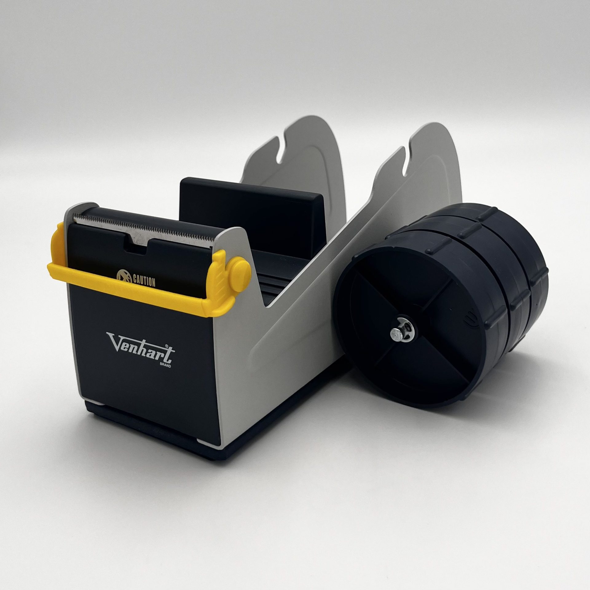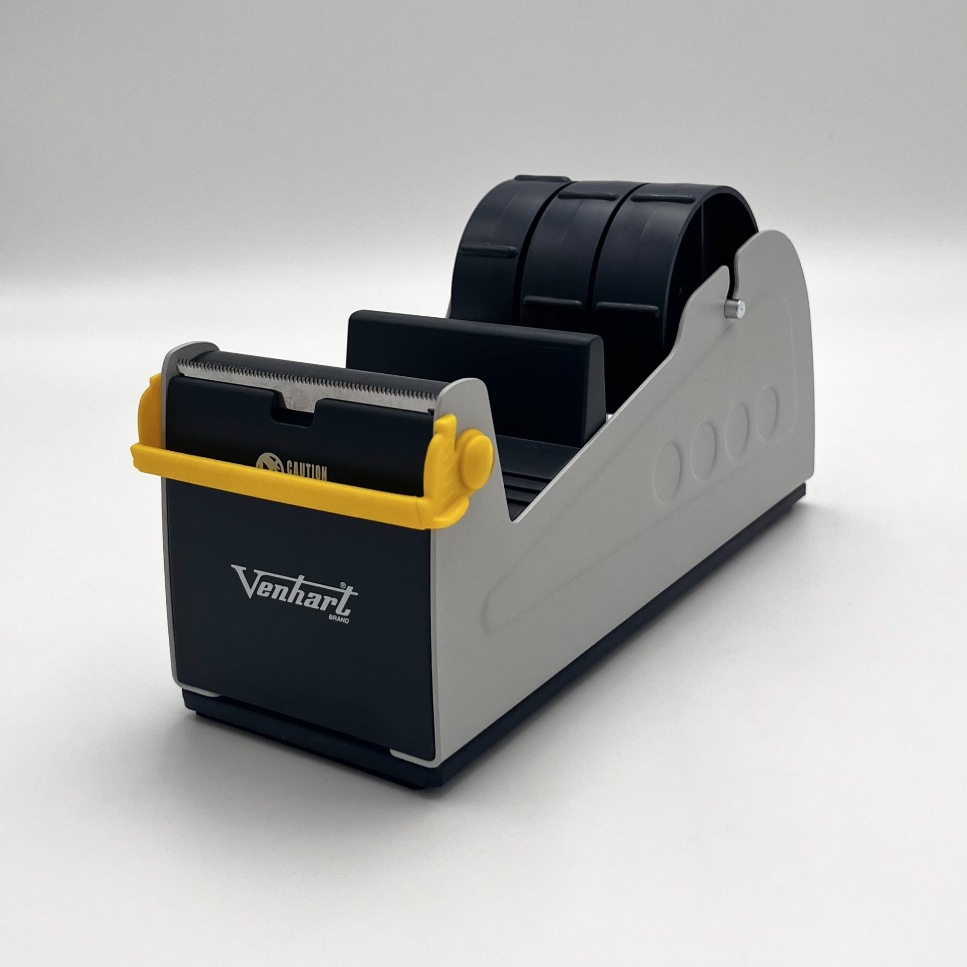 The VH443 is a triple spool tape dispenser with a solid metal frame and plastic spool. Features all-over rubber anti-slip base and a yellow safety guard to cover the blade, which is manually moved on and off as required to reduce the risk of injury.