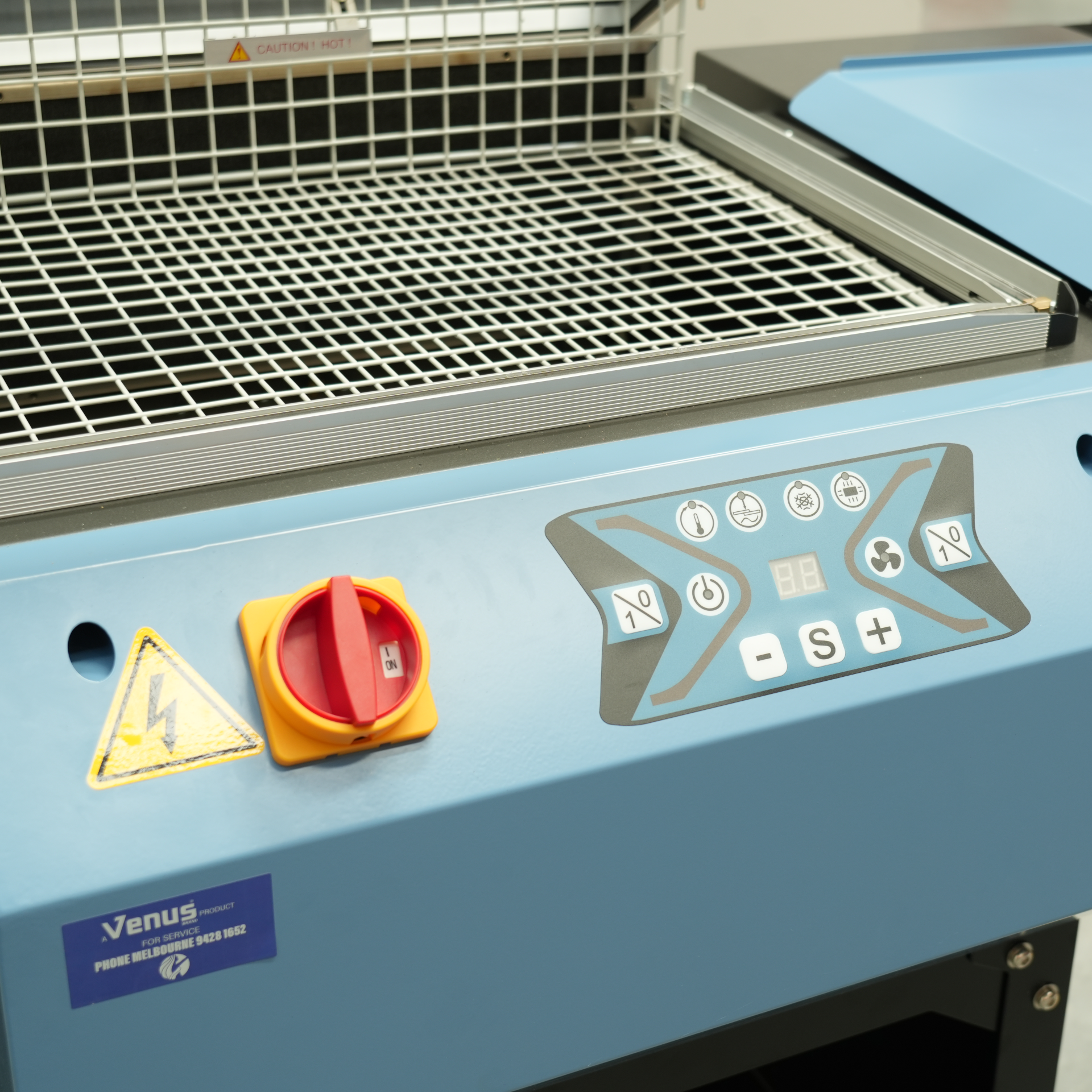 Seal only, or seal and shrink using PE, PVC and Polyolefin films. The touch pad control panel with digital read-out makes it easy to set up the perfect combination of seal time, seal temperature, shrink time and cooling time. Teflon coated sealing blades seal cleanly and efficiently.